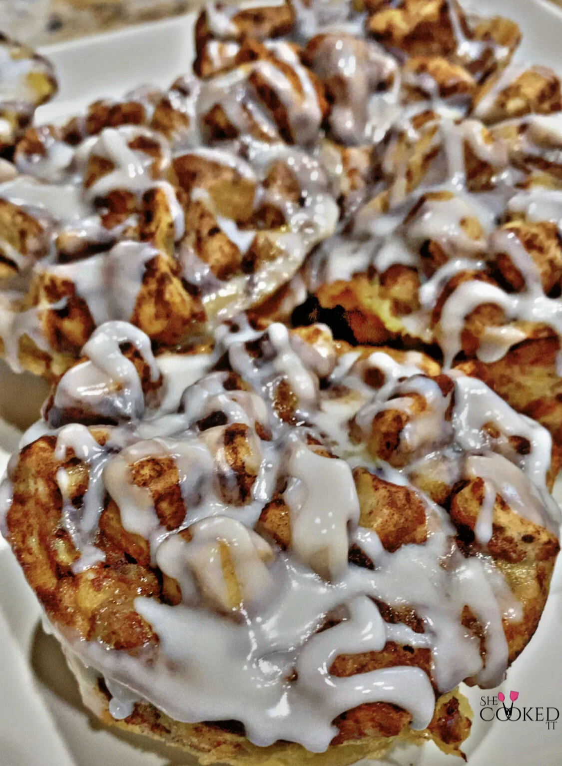 Open both cans of cinnamon rolls & cut into small squares, then set aside. Reserve cream cheese icing that comes with cinnamon rolls for later.